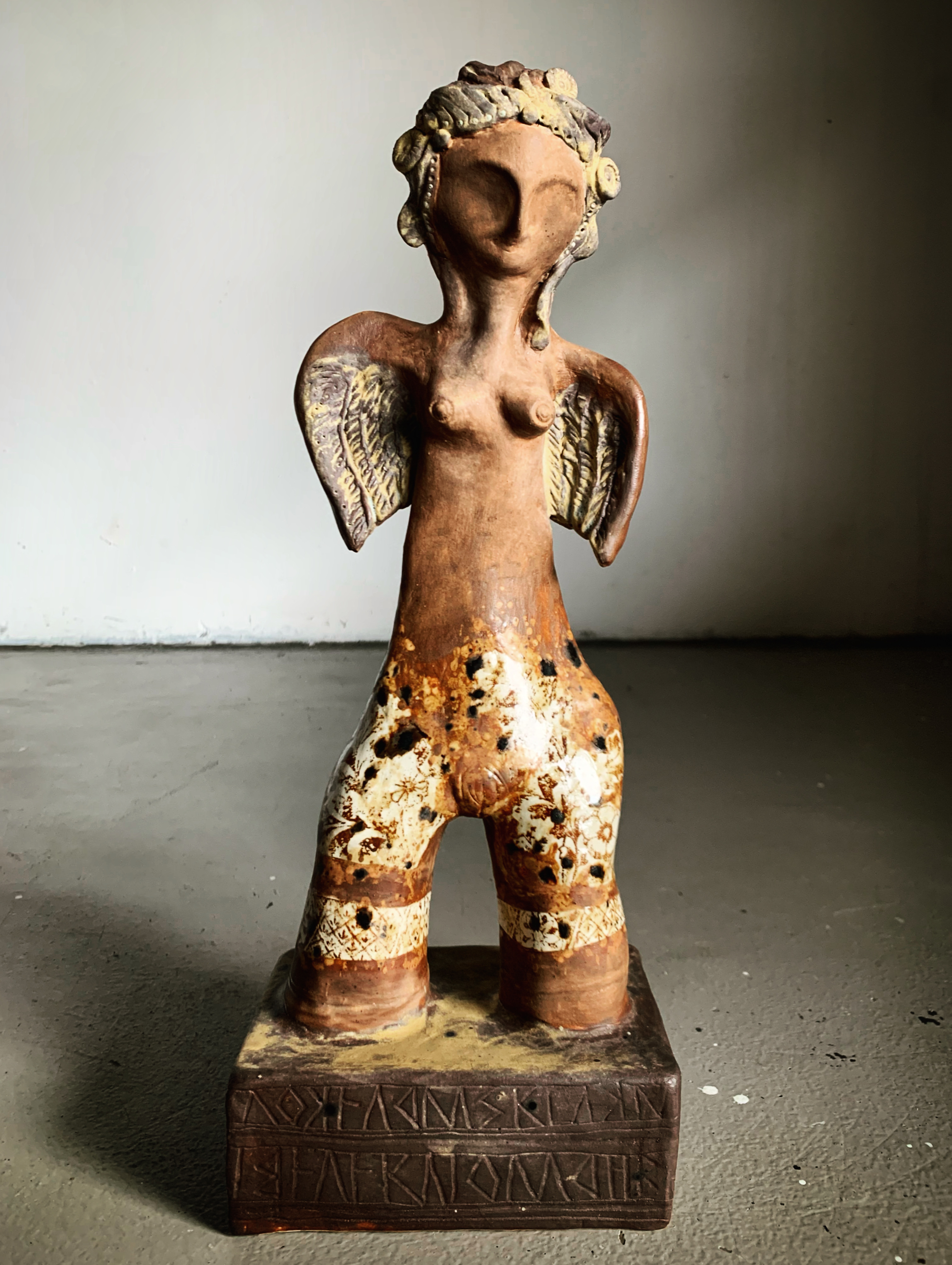 I am a third generation Australian of Greek and Latvian descent who grew up roaming the green hills of Bundjalung country. My practice spans hand-formed ceramics, found object assemblage, and mosaic. This piece was created during my 2025 residency at the Converge artists studio in Lismore. An incubator program funded by the NSW Reconstruction Authority to support the community arts sector in the wake of the 2022 Floods. Imbued with memory and a quiet sense of guardianship, this work is a luminous story-carrier. Layered glazes and ornate details give rise to symbolic beings—echoes of ancient worlds and sacred testimony to the personal realities of climate change. Born from the experience of the 2022 Lismore floods, this work reflects on how catastrophe alters us and how the objects we keep close can be both anchors and breakable.